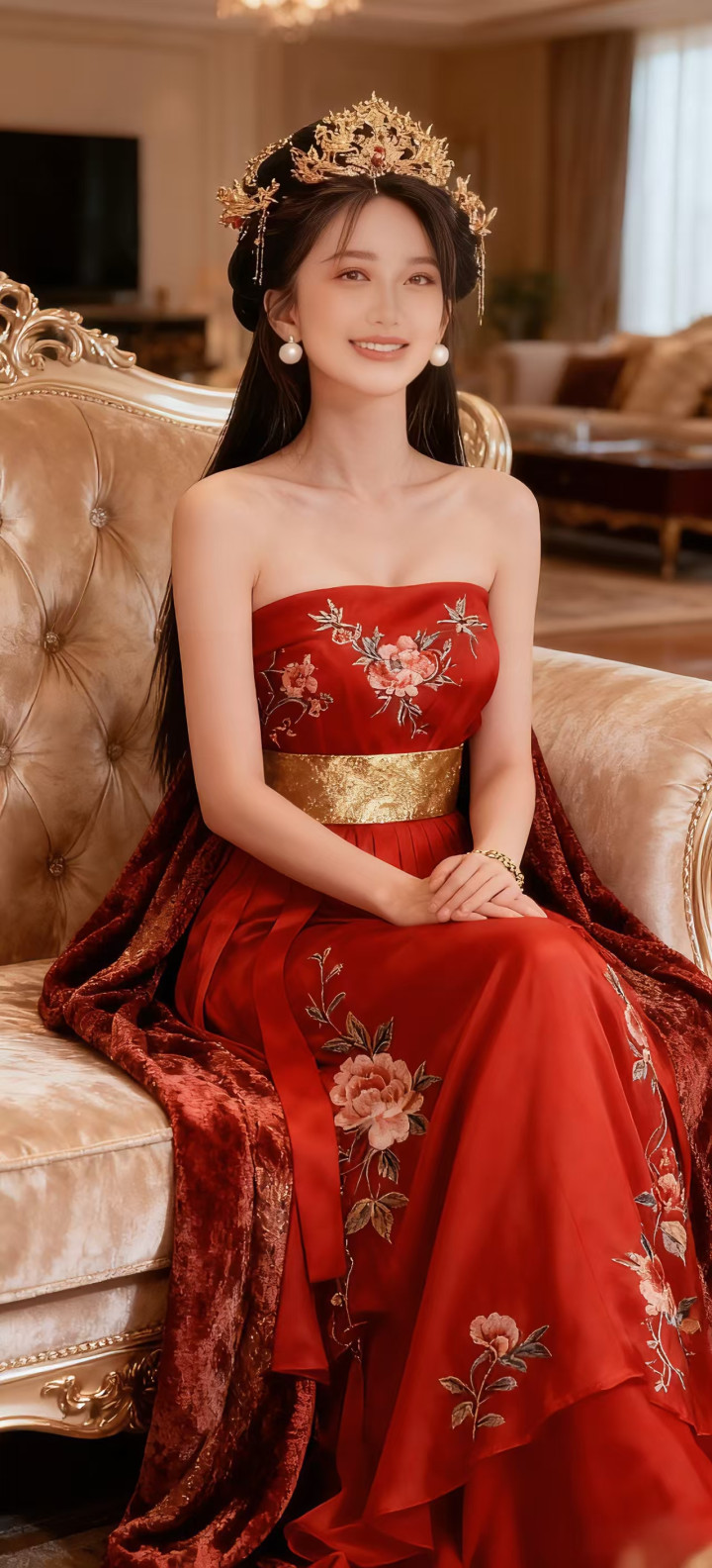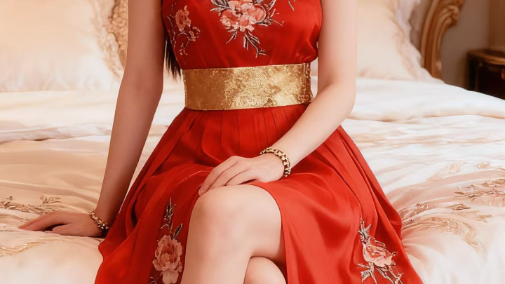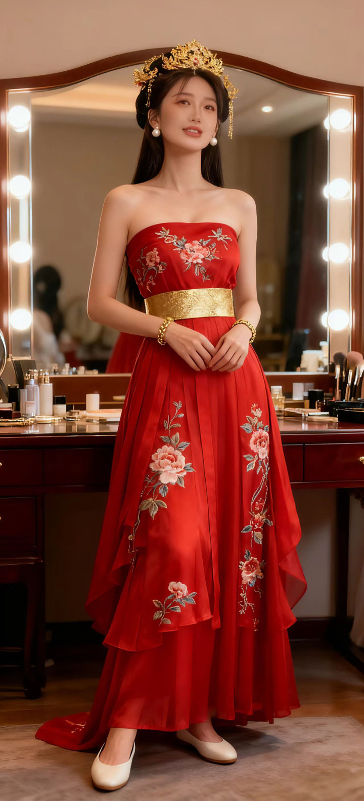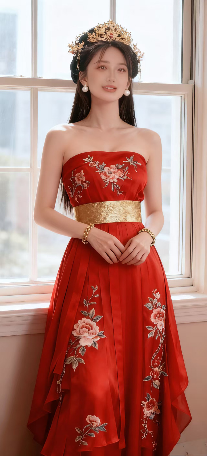 正红色抹胸长裙,裙身满绣精致的粉色花卉纹样,娇艳欲滴,尽显中式美学的雅致;腰间一条金色织锦腰带,华贵亮眼,巧妙勾勒出腰线,为整体造型注入了庄重的仪式感。搭配金色发饰与珍珠耳饰,举手投足间流露着古典韵味。正红的主色调热烈浓郁,花卉刺绣吉祥美好。整套穿搭将喜庆氛围与传统典雅完美融合,仿佛从盛唐画卷中走来的佳人,无论是出席婚宴还是传统庆典,都能成为焦点,将喜庆的意蕴展现得淋漓尽致。
